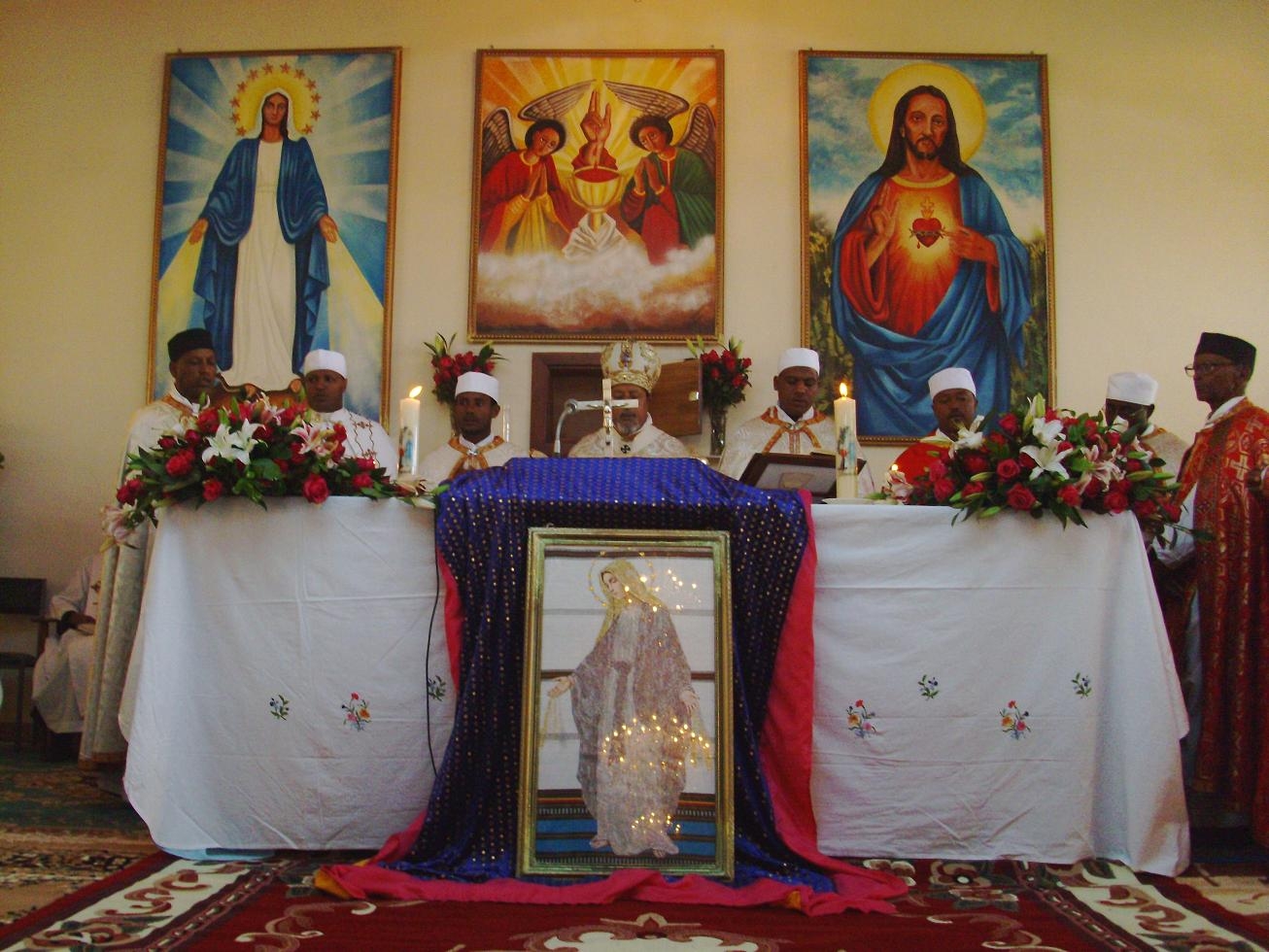 | Today, on BVM annual feast day a new church building was consecrated by His Grace Abune BerhaneYesus in the same compound where the Lazarist missionaries established themselves ninety years ago. The two hours long consecration procession was spiritually fulfilling as well breath-taking. Appropriate scriptures readings, prayers offerings and canticles were chanted at the four sides of the Church. While His Grace was anointing the wall with prism oil and sprinkled holy water. Special prayers were being offered at each side of which the first (west side) was for the vulnerable faithful: the sick, the aged and the disabled. Later on during the high solemn holy mass con celebrated by decades of priests, His Grace came a profound homily of which audio copy is found at WYWM MeriKokeb Library
